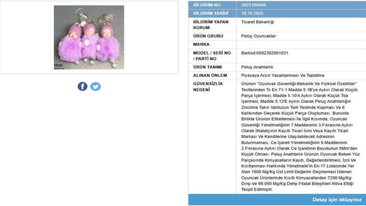 CE İşareti Yönetmeliğinin 9.maddesinin 2.fıkrasına aykırı olarak CE işaretinin boyutunun 5 mm'den küçük olması, peluş anahtarlık ürünün oyuncak bebek yüz parçasında Kimyasalların Kaydı, Değerlendirilmesi, İzni ve Kısıtlanması Hakkında Yönetmelik'in Ek-17 listesinde yer alan 1000 Mg/Kg üst limit değerini geçmemesi istenen oyuncak ürünlerinde kısıtlı kimyasallardan 7200 Mg/Kg Dınp ve 99.050 Mg/Kg Dehp fitalat bileşikleri ihtiva ettiği tespit edilmiştir.'' olarak açıklandı.