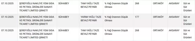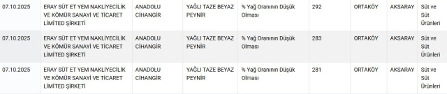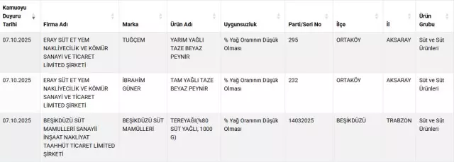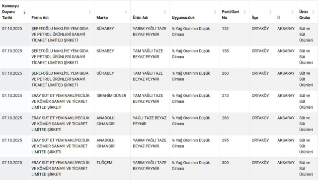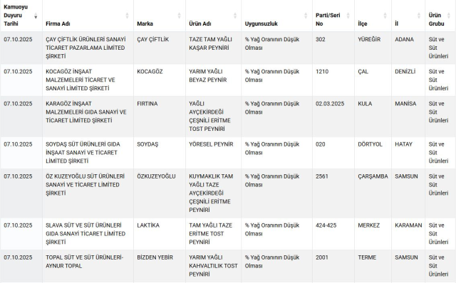 Listede yer alan peynir markaları (Bakanlık duyurusuna göre):Çay Çiftlik KaşarKocagöz Beyaz PeynirFırtına Eritme PeyniriSoydaş Yöresel PeynirÖzkuzeyoğlu Eritme PeyniriLaktika Tost PeyniriBizden Yebir Tost PeyniriSühabey Beyaz Peynirİbrahim Güner Beyaz PeynirAnadolu Cihangir Beyaz PeynirTuğçem Beyaz PeynirDİĞER TESPİTLER Endamoğlu markalı yoğurtta bitkisel yağ ve nişasta tespit edildi.Beşikdüzü markalı tereyağında ise yağ oranının düşük olduğu belirlendi.Bakanlık, denetim sonuçlarını kamuoyuyla paylaşarak tüketicileri uyarmayı ve hileli üretim yapan işletmelerin tespitini şeffaflaştırmayı amaçlıyor. Tüketiciler, şüpheli ürünler konusunda ilgili mevzuat kapsamında hareket edilmesi ve güncel listelerin düzenli takibi için guvenilirgida.tarimorman.gov.tr adresinden duyuruları kontrol edebilecek.