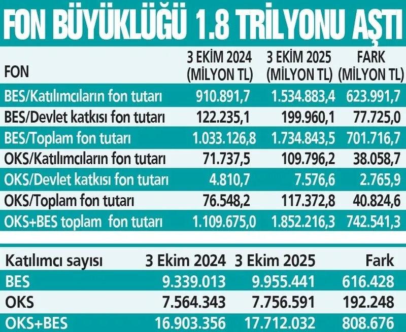 OKS dahil BES'te toplam katılımcı sayısı 17.7 milyonu, fon büyüklüğü de 1.8 trilyon lirayı aşarken, 1 yılda katılımcı sayısında yaklaşık 808 bin, fon tutarında 742 milyar liralık artış yaşandı.