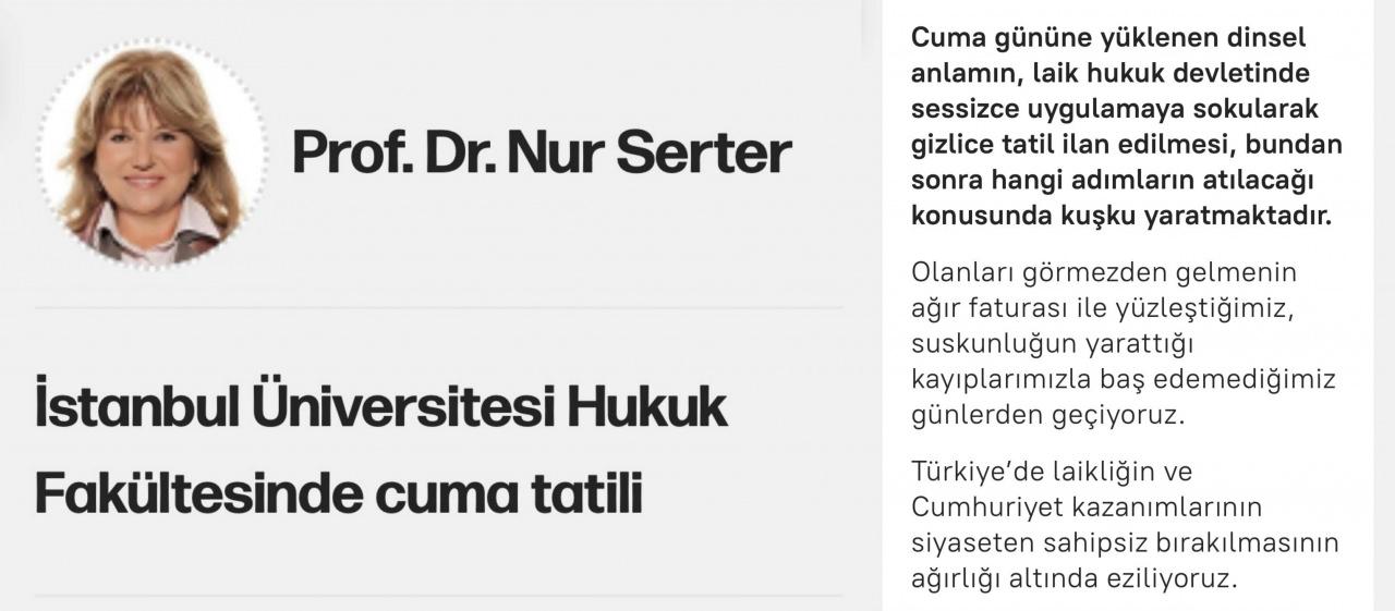 Nur Serter, 12punto haber sitesindeki “İstanbul Üniversitesi Hukuk Fakültesinde cuma tatili” başlıklı yazısında “Laikliğin kalesi, hukuk sisteminin bekçisi, çağdaş hukukçular yetiştirmenin öncüsü, ülkemizin gurur kaynağı, güvencesi olan İstanbul Hukuk Fakültesi alınan son kararla Cumhuriyet Devrimlerine savaş mı ilan ediyor? Fakültenin 2026 yılı Güz yarıyılı ders programlarında Cuma gününe ders konulmaması sinsi bir başkaldırının işareti midir?” dedi.