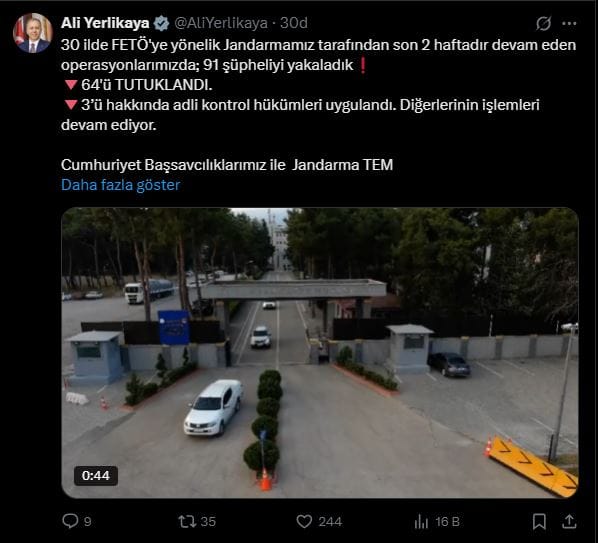 30 İLDE FETÖ OPERASYONU: YENİ YAPILANMADA YER ALAN 91 KİŞİ YAKALANDIBakan Yerlikaya'nın 2 hafta süren operasyonun detaylarına ilişkin paylaşımı şu şekilde: