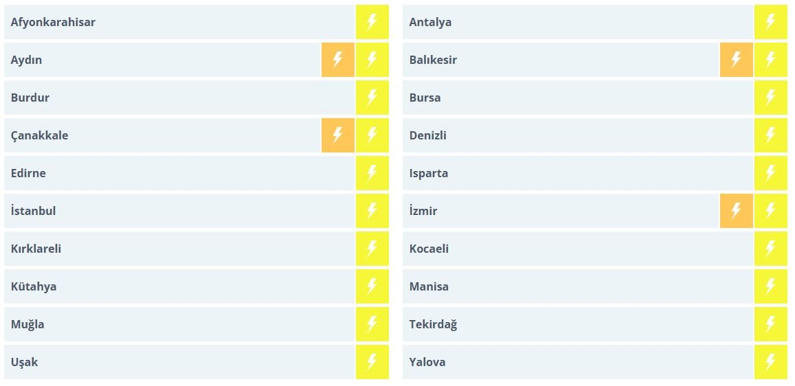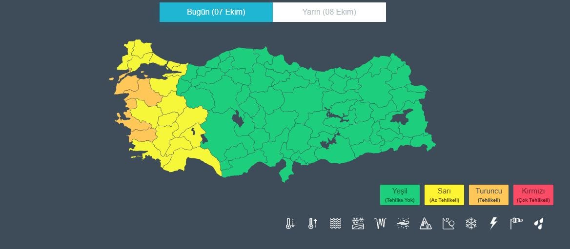KUVVETLİ YAĞIŞ UYARISI: Yağışların; Marmara, Ege ve Batı Akdeniz ile Ankara’nın batı ilçeleri ve Eskişehir çevrelerinde kuvvetli, Güney ve Kuzey Ege kıyılarında çok kuvvetli ve yerel şiddetli olması beklendiğinden, oluşabilecek olumsuzluklara (ulaşımda aksamalar, sel, su baskını, vb) karşı dikkatli ve tedbirli olunması gerekmektedir.