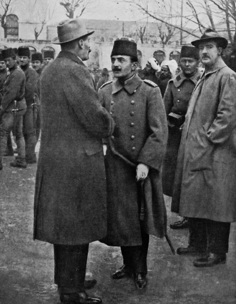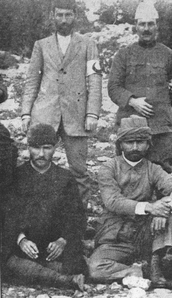 [Mustafa Kemal Atatürk (solda) ve Enver Paşa (sağda) Kızılay Heyeti ile Derne'de.]