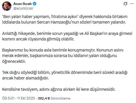 Ilıcalı Gazeteci Sercan Hamzaoğlu'nun ismini vererek yaptığı paylaşımda şu ifadeleri kullandı: