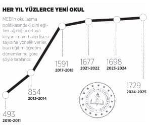 İMAM HATİP SEFERBERLİĞİİktidarın dini eğitim ağırlıklı okullaşma politikası, son 15 yılda adeta bir "imam hatip seferberliğine" dönüştü. MEB’in resmi verilerine göre, 2010-2011 eğitim öğretim yılında Türkiye genelinde 493 olan imam hatip ve Anadolu imam hatip lisesi sayısı, aradan geçen 14 yılda bin 236 adet artırılarak 2024-2025 dönemi itibarıyla bin 729’a fırladı. 2010'da bu okullarda 235 bin 639 öğrenci eğitim görürken, bugün binlerce yeni okulun inşa edilmesiyle bu sayı katlanarak arttı.