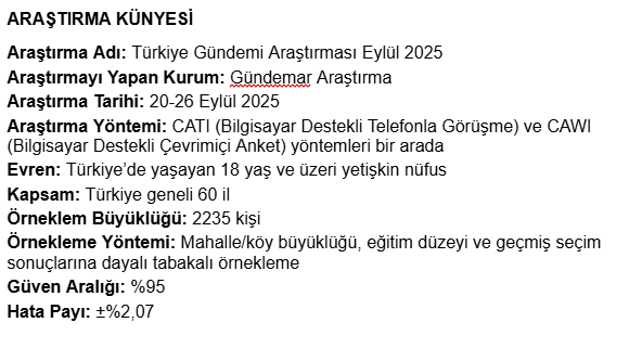 GÜNDEMAR Araştırma, "Türkiye Gündemi Araştırması Eylül 2025" sonuçlarını kamuoyu ile paylaştı.