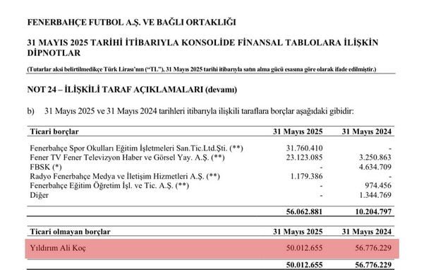 Söz konusu desteğin ardından sarı lacivertlilerin 31 Mayıs 2025 tarihli bilançosunda ise borcun 50 milyon 12 bin liraya indiği tablolara yansıdı. Böylece Ali Koç'un iki bilanço dönemi arasında borç olarak verdiği yaklaşık 360 milyon lirasını geri aldığı anlaşılıyor.