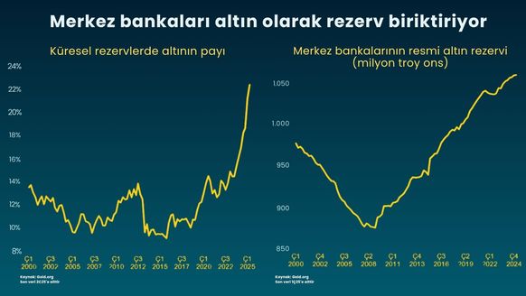 Peki altının temel yakıtı olan merkez bankalarının altın alımları durur mu? Önce son yıllarda neler olmuş ona bakalım. Ocak 2022'den bu yana merkez bankalarının aldığı altınlar ile satılanları karşılaştırırsak sadece 3 ay altın satışlarının alımlardan fazla olduğu görülüyor. 41 ay ise alımlar daha yüksek. Grafik bize genellikle merkez bankalarının fiyata göre yeniden alıma geçtiğini ancak satışın neredeyse hiç olmadığını gösteriyor. Bir başka rakam 2012'de toplam rezerv içinde yüzde 10'un altında olan altının payı son olarak yüzde 24'e kadar çıkmış. Merkez bankaları yaklaşık 1.1 milyar ons altını rezerv olarak tutmaya başlamış.