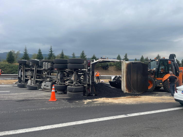 Otoyolun İstanbul istikameti 1. viyadük mevkisinde, plakası ve sürücüsünün ismi öğrenilemeyen asfalt yüklü kamyon devrildi.