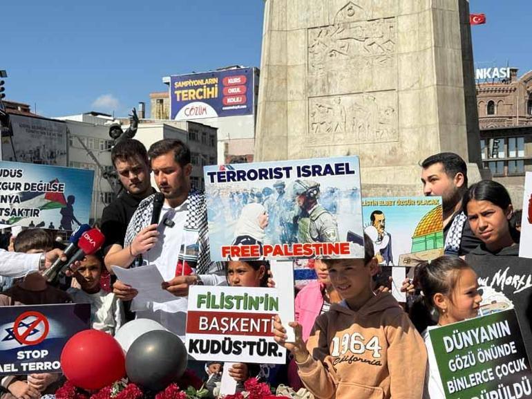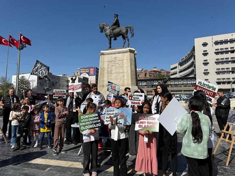 AK Parti Altındağ İlçe ve Gençlik Teşkilatı üyeleri, Ulus Meydanı'nda toplanarak, 'Filistin'e özgürlük' sloganları attı. Altındağ Gençlik Merkezi'nden çocukların da destek verdiği eylemde, Gazze'de yaşamını yitiren çocuklara dikkat çekilerek, temsili olarak çocuk pantolonu ve çocuk ayakkabısı sergilendi. Çocuklar tarafından 'Her yer Filistin, her yer Gazze', 'Filistin'in başkenti Kudüs'tür', 'Kudüs özgür değilse, dünya tutsaktır' afişleri açıldı.