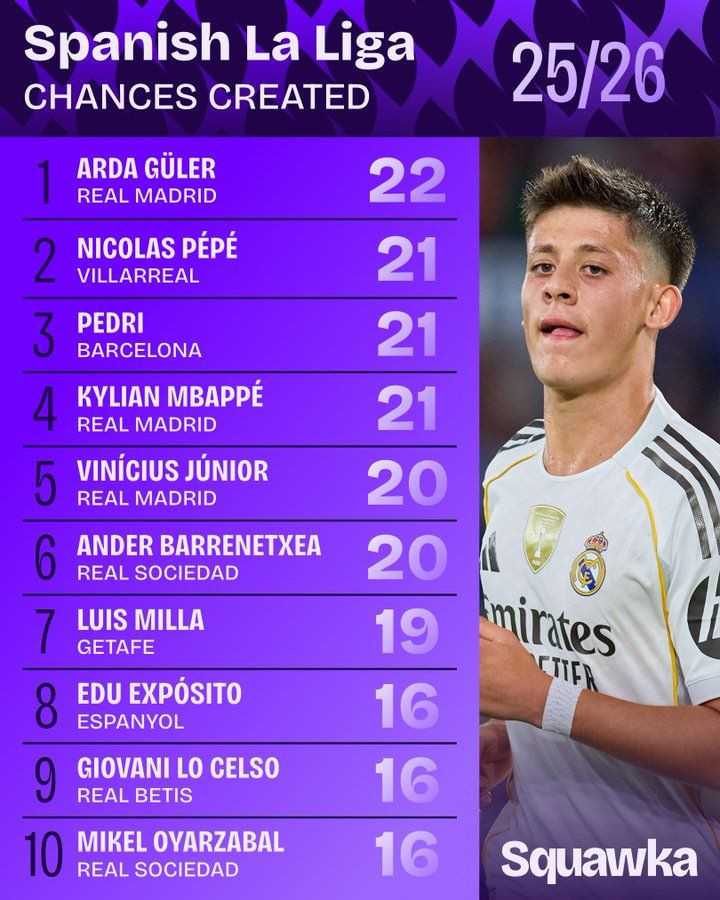 Veri analiz platformu Squawka’nın paylaştığı istatistiklere göre Arda Güler, La Liga’da Nicolas Pépé (Villarreal), Pedri (Barcelona), Kylian Mbappé ve Vinícius Júnior (Real Madrid) gibi yıldız isimleri geride bırakarak zirveye yerleşti.