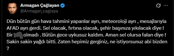 "Dün bütün gün hava tahmini yapanlar ayrı, meteoroloji ayrı, mesajlarıyla AFAD ayrı gerdi. Sel olacak, fırtına olacak, şehir başınıza yıkılacak diye! Bir *** olmadı. Bütün gece uykusuz kaldım. Aman sel olursa falan diye! Sakin sakin yağdı bitti. Zaten hepimiz gerginiz, ne istiyorsunuz abi bizden?"