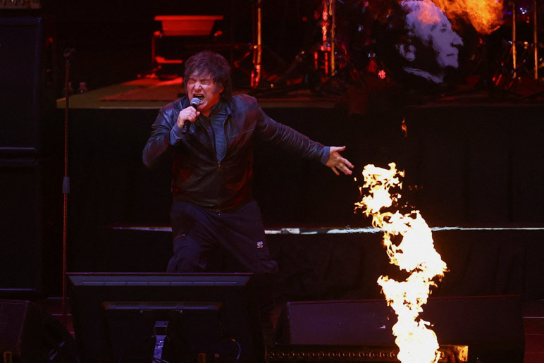Buenos Aires’teki Movistar Arena’da kendisini çılgınca alkışlayan 15 bimn kişinin önünde. “Ateşini yolla bana, aşkının ateşini yolla bana!” diye bağırdı Javier Milei boğuk sesiyle, siyah deri giysiler içinde, saçları dağınık bir halde.