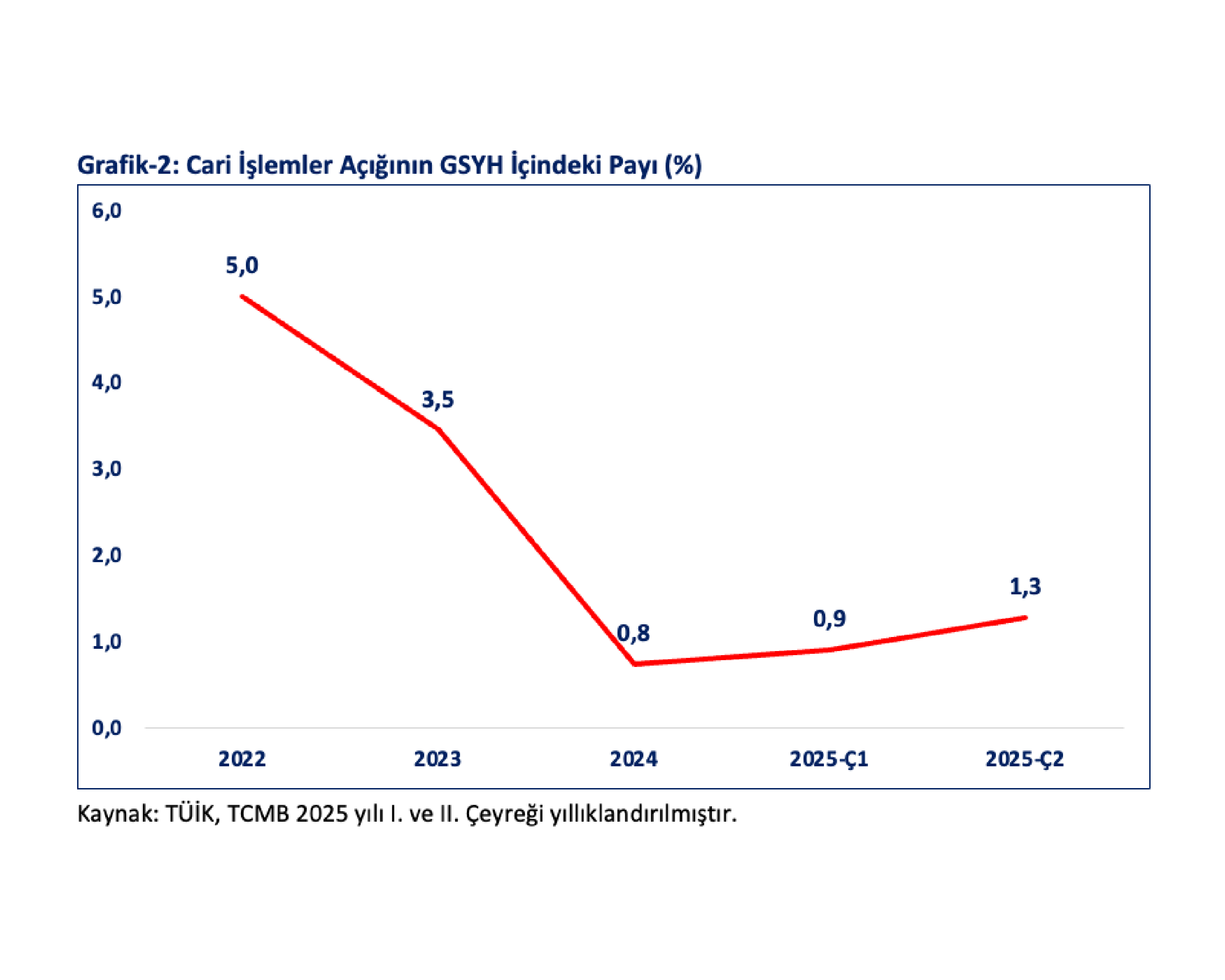 • 2022 yılında %5,0, 2023 yılında %3,5 ve 2024 yılında ise %0,8 olan cari işlemler açığının GSYH içindeki payı 2025 yılı ikinci çeyreği itibariyle yıllıklandırılmış olarak %1,3 olarak tarihsel ortalamasının (2002-2024 ortalaması: %3,5) altında seyretmeye devam etmektedir.