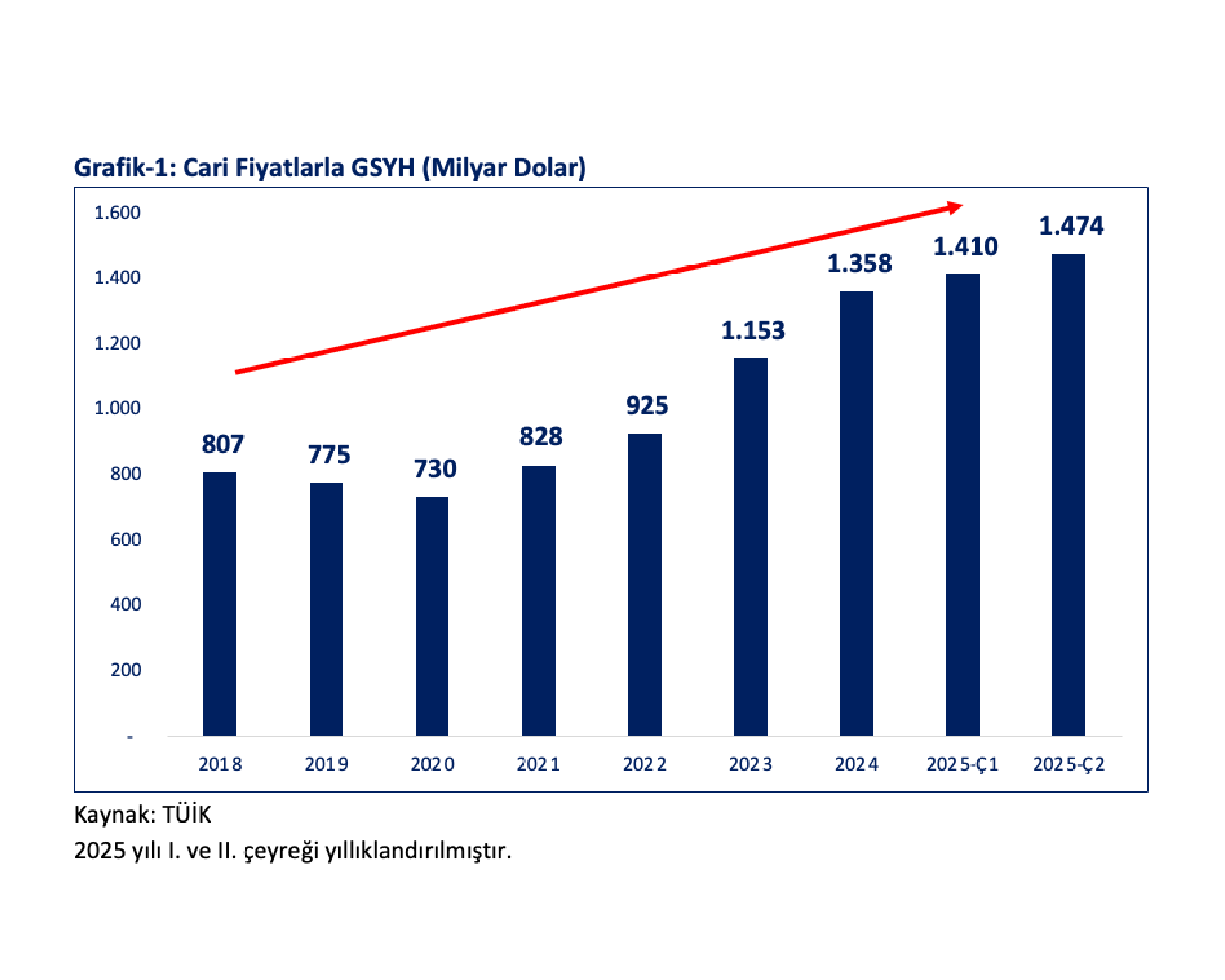 • 2022 yılında 925 milyar dolar olan cari fiyatlarla GSYH, 2024 yılında tüm zamanların rekorunu kırarak 1 trilyon 358 milyar dolara yükselmişti.