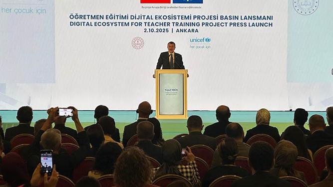 Milli Eğitim Bakanı Yusuf Tekin, Ankara'da 'Öğretmen Eğitimi Dijital Ekosistemi Projesi'nin tanıtım programında konuştu. Avrupa Birliği Katılım Öncesi Yardım Aracı (IPA-III) 2021-2027 dönemi kapsamında desteklenen proje, Birleşmiş Milletler Çocuklara Yardım Fonu (UNICEF) tarafından yürütülüyor. Öğretmenlerin dijital yetkinliklerinin artırılmasını hedefleyen proje, 1 Şubat 2023 tarihinde başlatıldı ve 36 ay süreyle devam edecek. Tanıtım programına, Bakan Tekin ile birlikte, Yenilik ve Eğitim Teknolojileri Genel Müdürü Mustafa Canlı, Milli Eğitim Akademisi Başkanı Ali Fuat Arıcı, UNİCEF Temsilcisi Paolo Marchi, Avrupa Birliği Türkiye Delegasyonu Başkan Vekili Jurgis Vilcinskas, sivil toplum kuruluşları temsilcileri, öğretmenler ve davetliler katıldı.