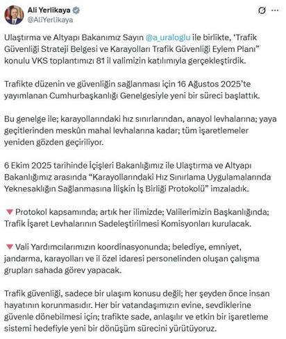 İçişleri Bakanı Ali Yerlikaya ile Ulaştırma ve Altyapı Bakanı Abdulkadir Uraloğlu, 81 ilin valisi ile 'Trafik Güvenliği Strateji Belgesi ve Karayolları Trafik Güvenliği Eylem Planı' konulu video konferans toplantısı gerçekleştirdi. Bakan Yerlikaya, sosyal medya hesabından yaptığı açıklamada, "Trafikte düzenin ve güvenliğin sağlanması için 16 Ağustos 2025'te yayımlanan Cumhurbaşkanlığı genelgesiyle yeni bir süreci başlattık. Bu genelge ile kara yollarındaki hız sınırlarından anayol levhalarına, yaya geçitlerinden meskun mahal levhalarına kadar tüm işaretlemeler yeniden gözden geçiriliyor. 6 Ekim 2025 tarihinde İçişleri Bakanlığımız ile Ulaştırma ve Altyapı Bakanlığımız arasında 'Karayollarındaki Hız Sınırlama Uygulamalarında Yeknesaklığın Sağlanmasına İlişkin İş Birliği Protokolü' imzaladık. Protokol kapsamında; artık her ilimizde valilerimizin başkanlığında 'Trafik İşaret Levhalarının Sadeleştirilmesi Komisyonları' kurulacak. Vali yardımcılarımızın koordinasyonunda; belediye, emniyet, jandarma, karayolları ve il özel idaresi personelinden oluşan çalışma grupları sahada görev yapacak. Trafik güvenliği, sadece bir ulaşım konusu değil; her şeyden önce insan hayatının korunmasıdır. Her bir vatandaşımızın evine, sevdiklerine güvenle dönebilmesi için trafikte sade, anlaşılır ve etkin bir işaretleme sistemi hedefiyle yeni bir dönüşüm sürecini yürütüyoruz" dedi.