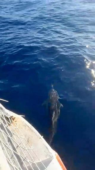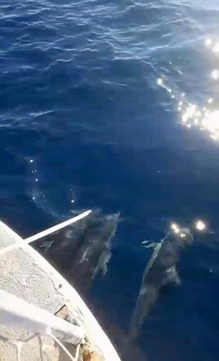 Balıkçı teknesinin yanında yüzen yunuslar kamerada
