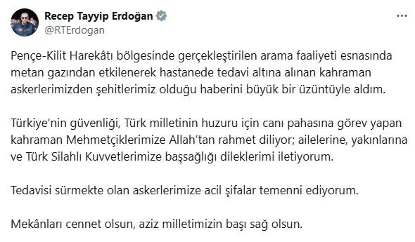 Erdoğan mesajında, "Pençe-Kilit Harekâtı bölgesinde gerçekleştirilen arama faaliyeti esnasında metan gazından etkilenerek hastanede tedavi altına alınan kahraman askerlerimizden şehitlerimiz olduğu haberini büyük bir üzüntüyle aldım.