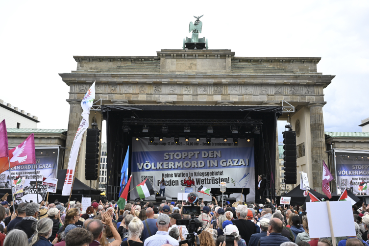 İsrail'in Gazze'ye yönelik saldırılarını ve dünyadaki savaş bölgelerine silah sağlanmasını protesto etmek için binlerce kişi, başkentin merkezinde tarihi Brandenburg Kapısı'nın önünde toplandı.