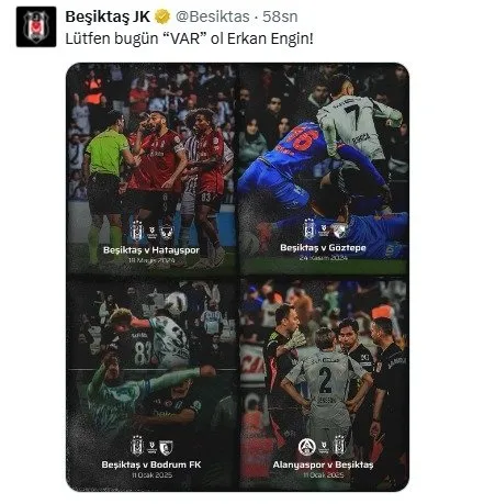 Kulübün sosyal medya hesaplarından yapılan paylaşımda Göztepe maçının VAR hakemi olarak atanan Erkan Engin'in daha önce Beşiktaş'ın aleyhine verdiği hatalı kararları eleştirdi. Beşiktaş, "Lütfen bugün "VAR" ol Erkan Engin!" ifadelerini kullandı.
