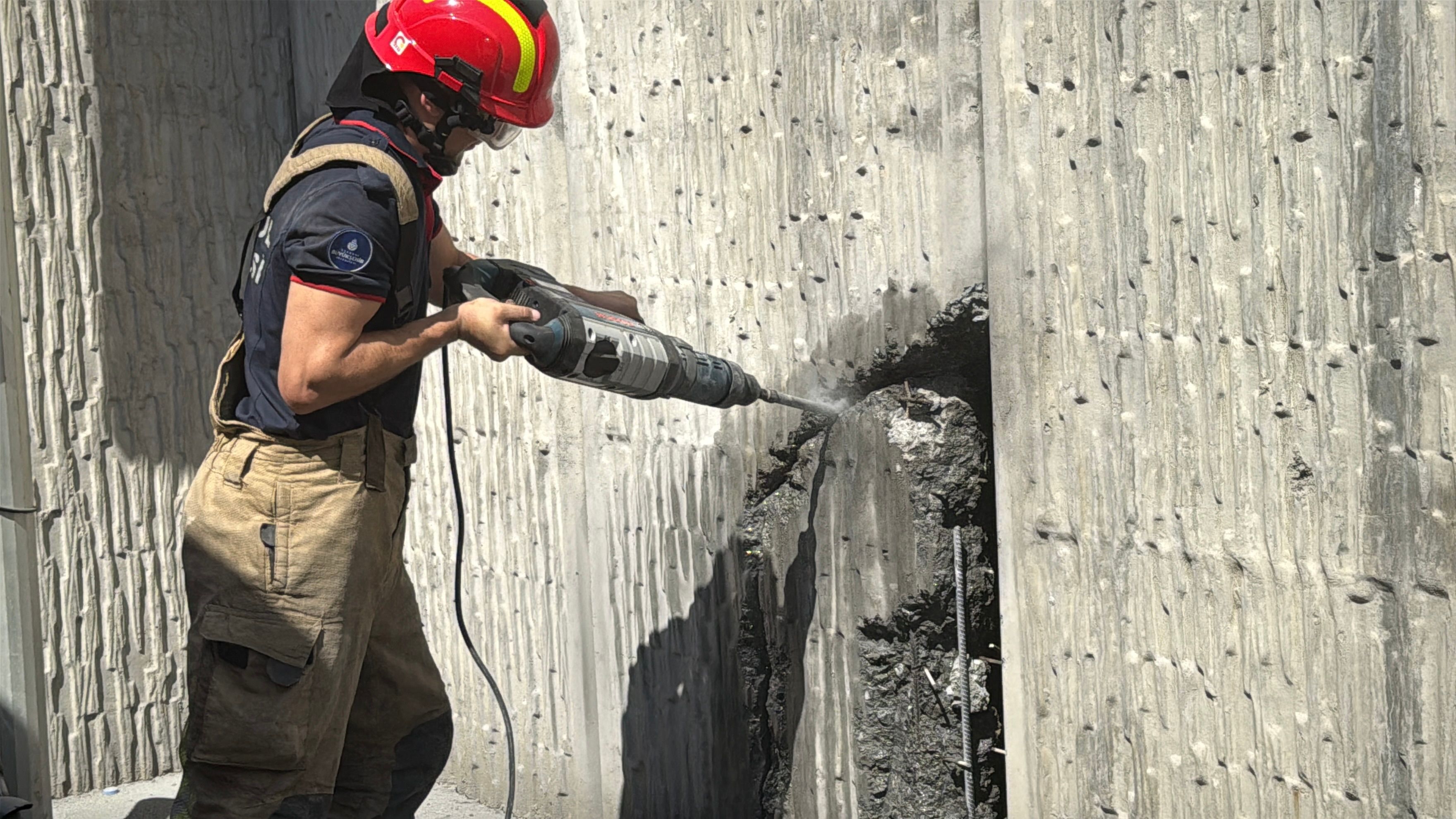 Durumun tespiti üzerine Beyoğlu Devriye Ekipler Amirliği'ne bağlı polisler, dar alandan sürünerek içeri girdi ve duvarın arkasında mahsur kalan kişiye ulaştı. Şahsın yarı çıplak, son derece bitkin ve vücudunun çeşitli yerlerinde yaralar içinde olduğu görüldü. Ancak adamın bitkin olması ve alanın son derece dar olması nedeniyle bulunduğu yerden çıkarılması mümkün olmadı. Bunun üzerine itfaiye ekipleri, devreye girerek kurtarma operasyonunun en kritik aşamasını başlattı. Yaklaşık 15 santimetre kalınlığındaki beton duvar, önce darbeli matkapla, ardından beton kesme aletiyle delinmeye başlandı. Duvar içindeki demirlerin de kesilmesinin ardından balyoz yardımıyla bir kişinin geçebileceği genişlikte bir delik açıldı.