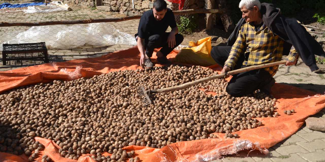 Yamaçlardaki ağaçlardan özenle topladıkları cevizi yeşil kabuklarından ayırarak kurutan yetiştiriciler, elde ettikleri ürünün bir kısmını ihtiyaçları için ayırıyor, kalan kısmını da satışa sunuyor.