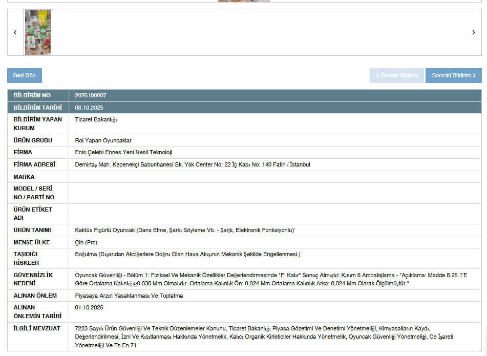 Ticaret Bakanlığı, 8 Ekim 2025 tarihli duyurusunda, “kaktüs figürlü dans eden, şarkı söyleyen ve şarjlı elektronik fonksiyonlu oyuncak” ürününün çocuklar için boğulma riski taşıdığı gerekçesiyle güvensiz ürün olarak değerlendirdi.