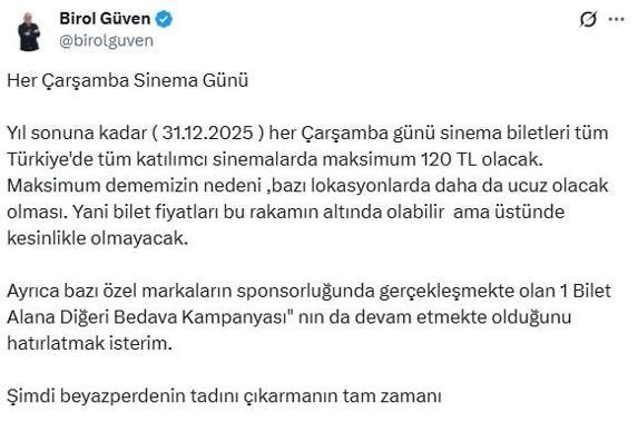 Sinema Genel Müdürü Birol Güven, sosyal medya hesabından yaptığı paylaşımda yıl sonuna kadar her çarşamba sinema biletlerinin maksimum 120 TL olacağını duyurdu. Güven, "Yıl sonuna kadar (31 Aralık 2025) her çarşamba günü sinema biletleri tüm Türkiye'de, tüm katılımcı sinemalarda maksimum 120 TL olacak. Maksimum dememizin nedeni bazı lokasyonlarda daha da ucuz olacak olması. Yani bilet fiyatları bu rakamın altında olabilir ama üstünde kesinlikle olmayacak. Ayrıca bazı özel markaların sponsorluğunda gerçekleşmekte olan '1 Bilet Alana Diğeri Bedava Kampanyası'nın da devam etmekte olduğunu hatırlatmak isterim. Şimdi beyaz perdenin tadını çıkarmanın tam zamanı" ifadelerini kullandı.
