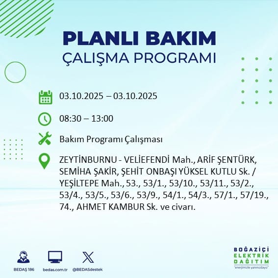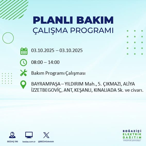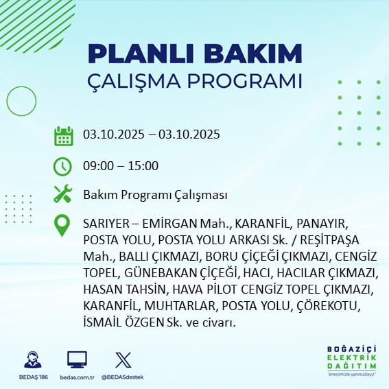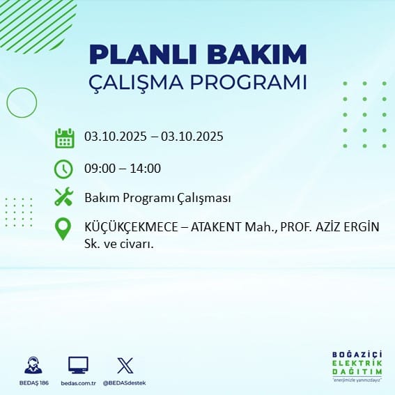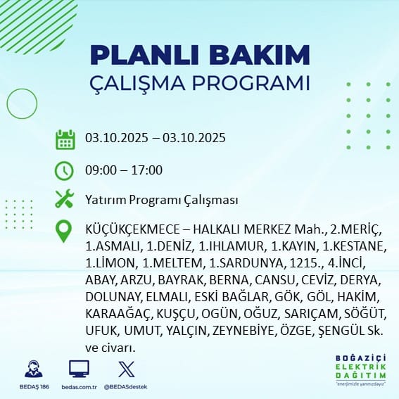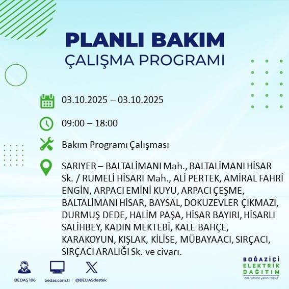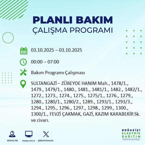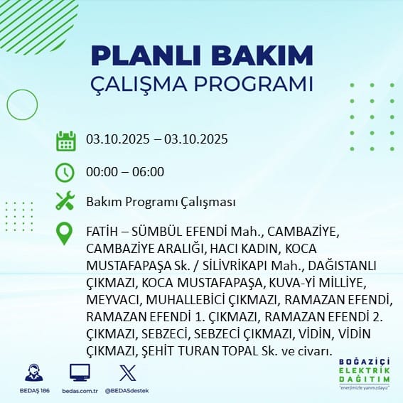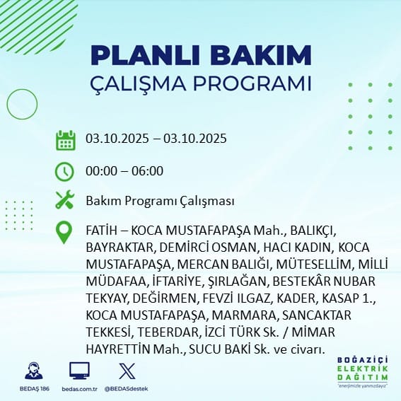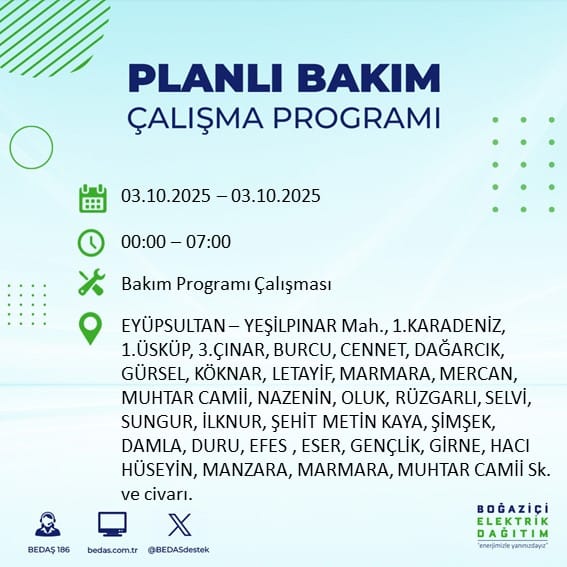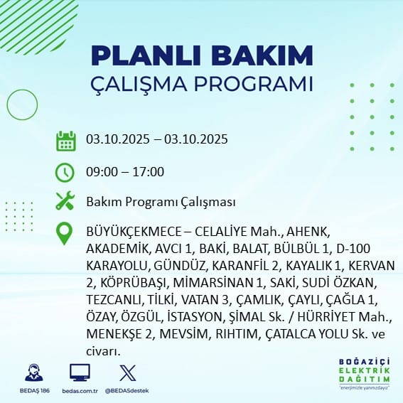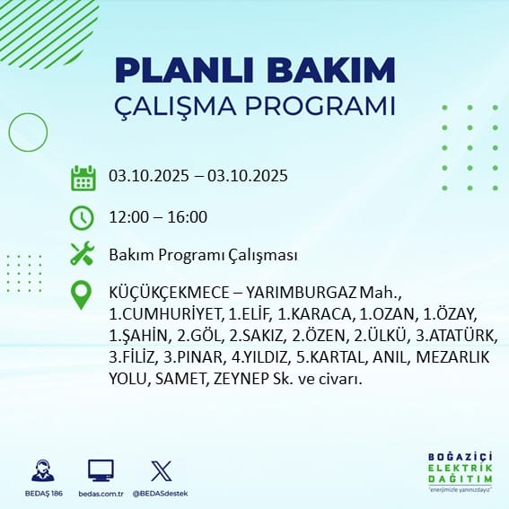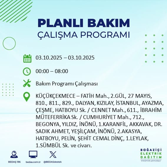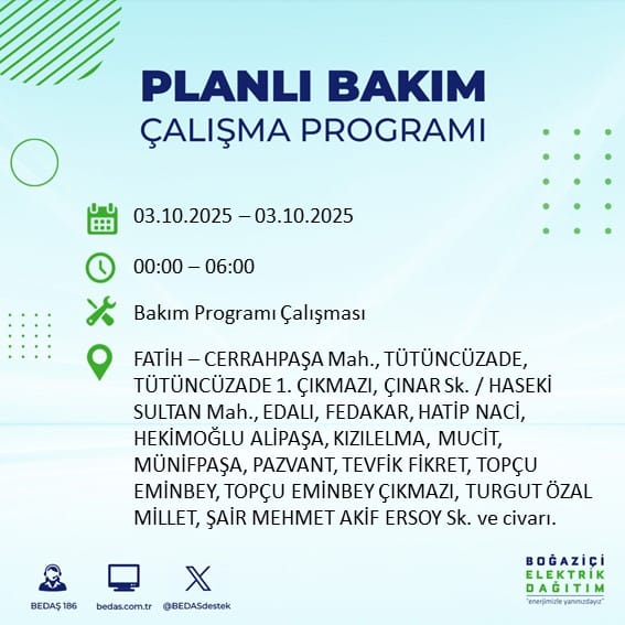3 Ekim 2025 Cum gününün ilk saatlerinden yapılacak olan kesintiler, şu ilçeleri kapsıyor: