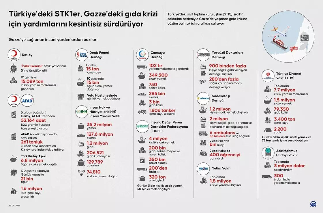 Gazze'ye bugüne kadar yardım gönderen STK'ların başında yer alan Türk Kızılay, "İyilik Gemisi" olarak da anılan sevkiyatların 5'ine öncülük etti. Türk Kızılay, bu gemilerin 10'uyla başta gıda, hijyen, barınma ve tıbbi malzeme olmak üzere toplam 900 tıra yakın yükle insani yardım malzemesini bölgeye gönderdi.