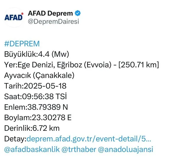 Ege Denizi'nde sabah saatlerinde korku dolu anlar yaşandı. AFAD, depremin merkez üssünün Çanakkale'nin Ayvacık ilçesi olduğunu duyurdu. Saat 09:56'da meydana gelen sarsıntının büyüklüğü 4,4 olarak açıklanırken, depremin yerin 6,72 kilometre derinliğinde gerçekleştiği bildirildi.