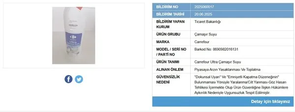 Ticaret Bakanlığı, güvenli olmayan ürünlere ilişkin bilgilerin paylaşıldığı Güvensiz Ürün Bilgi Sistemi (GÜBİS) üzerinden aldığı kararı kamuoyuna duyurdu. Açıklamada, "Carrefour Ultra Çamaşır Suyu"nun satışının yasaklandığı ve piyasadaki mevcut ürünlerin toplatılması için gerekli işlemlerin başlatıldığı bildirildi.