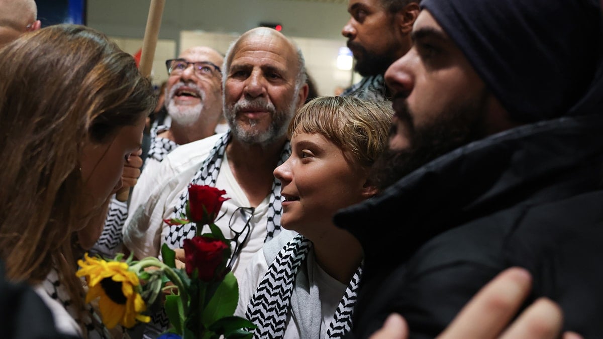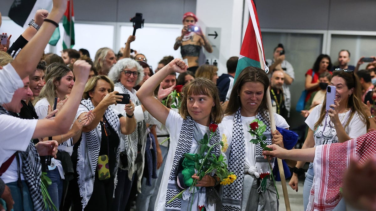 Gazze'ye insani yardım götürmek ve İsrail'in Gazze ablukasını kırmak amacıyla yola çıkan Küresel Sumud Filosu'nda alıkonulan, ardından İsrail'in sınır dışı ettiği Thunberg ve çok sayıda aktivist Yunanistan'ın başkenti Atina'daki Eleftherios Venizelos Havalimanı'nda karşılandı.