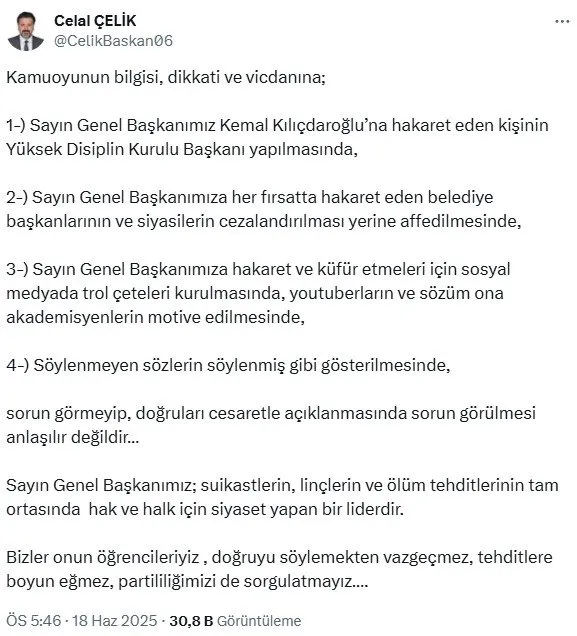 Celal Çelik açıklamasında, Kemal Kılıçdaroğlu'na hakaret ettiği bilinen kişilerin CHP içinde önemli görevlere getirildiğini ifade ederek, şu maddelere dikkat çekti: