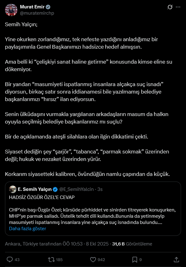 Emir, Yalçın'ın CHP liderini 'hadsizce' hedef aldığını belirtip paylaşımında 'MHP'lilerin suçsuzluğunun ispatlandığına' yönelik ifadelerindeki büyük çelişkiyi anlattı:
