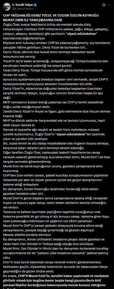 Semih Yalçın paylaşımını, "CHP yağdanlığı Deniz Yücel ve Özgür Özel'in kuyruğu Murat Emir ile yanaşmasına dair" başlığıyla yayımladı.