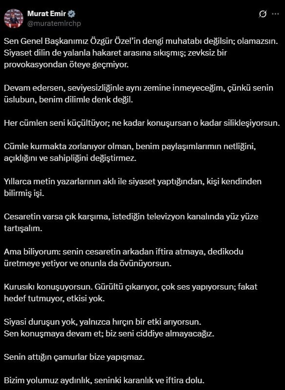 "Sen Genel Başkanımız Özgür Özel'in dengi muhatabı değilsin; olamazsın. Siyaset dilin de yalanla hakaret arasına sıkışmış; zevksiz bir provokasyondan öteye geçmiyor.