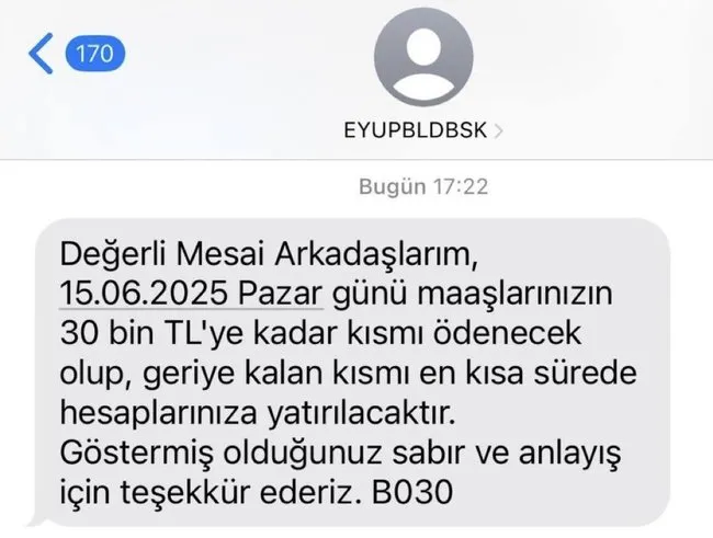 Mart ayında tarihinde ilk kez memur maaşlarını gününde ödeyemeyen Eyüpsultan Belediyesi, Haziran ortasında yeni bir finansal darboğazla karşı karşıya kaldı. Belediye yönetimi, maaş ödeme tarihine yalnızca iki gün kala çalışanlara gönderdiği SMS ile, ödemelerin bu ay tam yapılamayacağını bildirdi. Mesajda, yalnızca 30 bin TL'ye kadar olan kısmın ödeneceği, kalan meblağın ise "en kısa sürede" yatırılacağı duyuruldu.