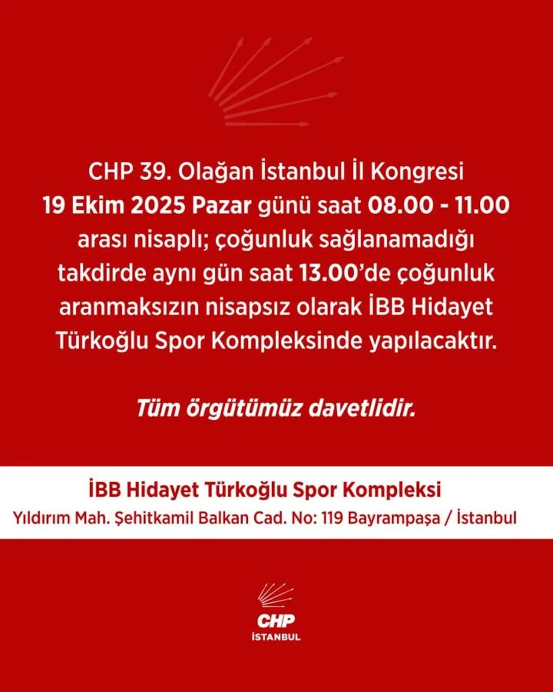 Cumhuriyet Halk Partisi (CHP) İstanbul İl Başkanlığı, 39. Olağan İl Kongresi'nin tarih ve yeri belli oldu. Yapılan açıklamada olağan kongrenin 19 Ekim 2025 Pazar günü, Bayrampaşa'da bulunan İBB Hidayet Türkoğlu Spor Kompleksi'nde gerçekleştirileceği bildirdi.