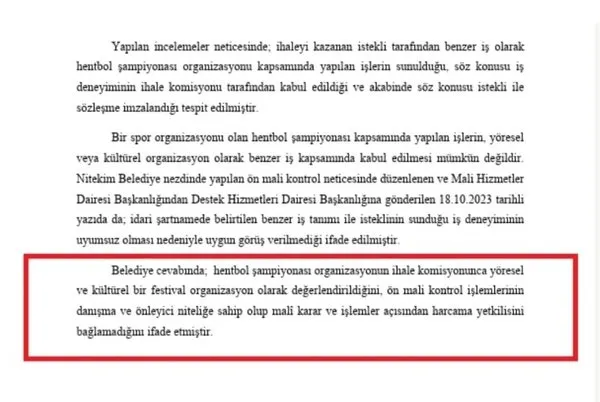 Şartnamede yer alan "Yöresel, kültürel festival organizasyonları düzenlemiş olmak" kriterine karşın ihaleyi kazanan istekli tarafından benzer iş olarak, hentbol şampiyonası organizasyonu kapsamında yapılan işlerin sunulduğu tespitine yer verilen Sayıştay raporunda, "Bir spor organizasyonu olan hentbol şampiyonası kapsamında yapılan işlerin, yöresel veya kültürel organizasyon olarak benzer iş kapsamında kabul edilmesi mümkün değildir" denildi.