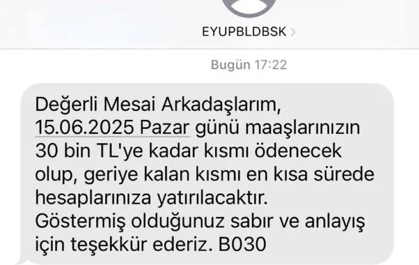 AK Parti'den CHP'ye geçen belediyelerdeki skandallara her geçen gün bir yenisi daha ekleniyor. Personel maaşlarını ödeyemeyecek duruma gelen CHP'li Eyüpsultan Belediyesi, çareyi belediye arazilerini satmakta buldu. Belediye tarafından gönderilen mesajda, "Değerli mesai arkadaşlarım, 15.06.2025 Pazar günü maaşlarınızın 30 bin TL'ye kadar kısmı ödenecek olup, geriye kalan kısmı en kısa sürede hesaplarınıza yatırılacaktır. Göstermiş olduğunuz sabır ve anlayış için teşekkür ederiz." ifadeleri yer aldı.