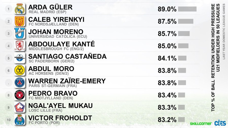 Arda, yüksek pres altında topu koruma oranı %89 olan en başarılı U21 oyuncu.