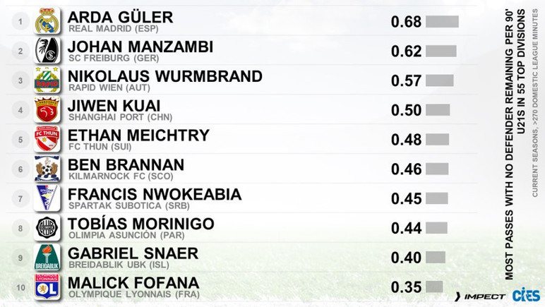 İleri istatistikler, Arda’nın etkisini daha da vurguluyor. CIES Football Observatory’nin iki yeni raporuna göre Arda Güler, dünyadaki en iyi 21 yaş altı futbolcu konumunda — hem “baskı altında topu koruma oranında” hem de “takım arkadaşını kaleye yaklaştıran pas sayısında” zirvede.