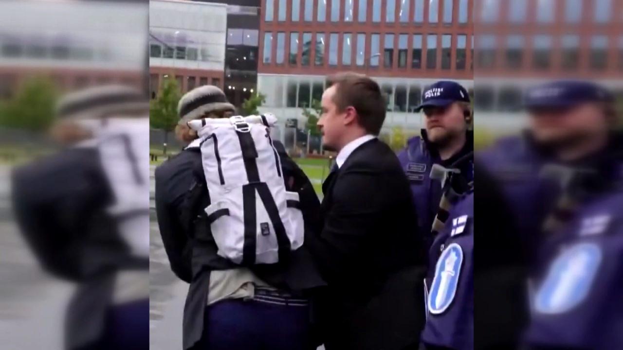 Stubb’un aracına binmesinin ardından bir yetkili beraberindeki polis memuru ile gazeteciye müdahale etti. Yetkili,