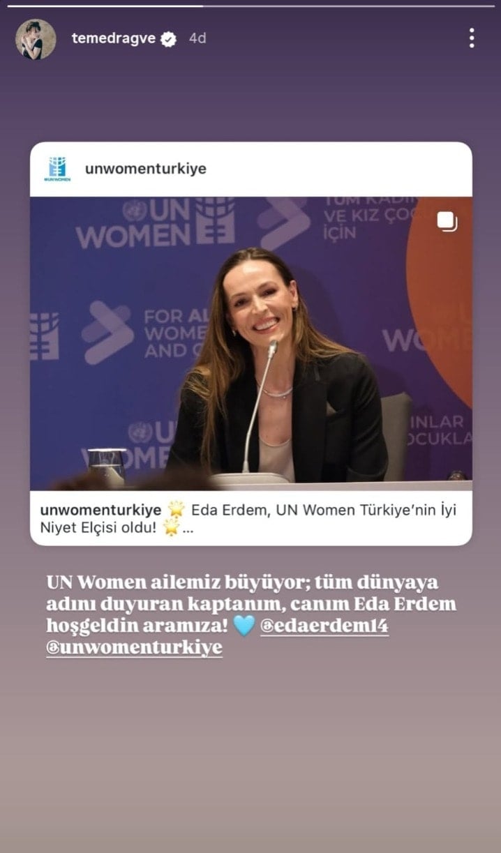 "UN Women ailemiz büyüyor; tüm dünyaya adını duyuran kaptanım, Canım Eda Erdem hoşgeldin aramıza"