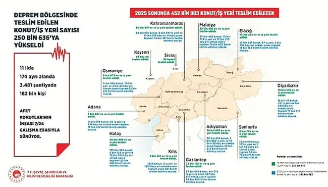 Çevre, Şehircilik ve İklim Değişikliği Bakanlığı, Kahramanmaraş depremlerinin ardından bugüne kadar 250 bin konutun hak sahiplerine verildiğini, yıl sonuna kadar teslim edilen konut ve iş yeri sayısının 452 bin 983'e ulaşacağını bildirdi. Bakanlıktan yapılan açıklamaya göre, TOKİ Başkanlığı, Emlak Konut GYO, Yapı İşleri Genel Müdürlüğü, Kentsel Dönüşüm Başkanlığı ve İller Bankası işbirliğinde, 11 ildeki 3 bin 481 şantiyede 182 bin mimar, mühendis ve işçi ile ev ve iş yerleri yeniden inşa ediliyor. Bölgede tamamlanan konut ve iş yeri sayısı 250 bin 636'ya yükselirken, yıl sonuna kadar 358 bin 859'u konut, 31 bin 307'si iş yeri ve 62 bin 817'si ise köy evi olmak üzere toplam 452 bin 983 bağımsız bölümün teslim edilmesi hedefleniyor. Hatay'da teslim edilen konut ve iş yeri sayısının 68 bin 406'ya yükselirken, yıl sonuna kadar 133 bin 382 konut, 9 bin 103 iş yeri ve 10 bin 763 köy evi olmak üzere 153 bin 248 konut ve iş yerinin yapımı tamamlanacak.