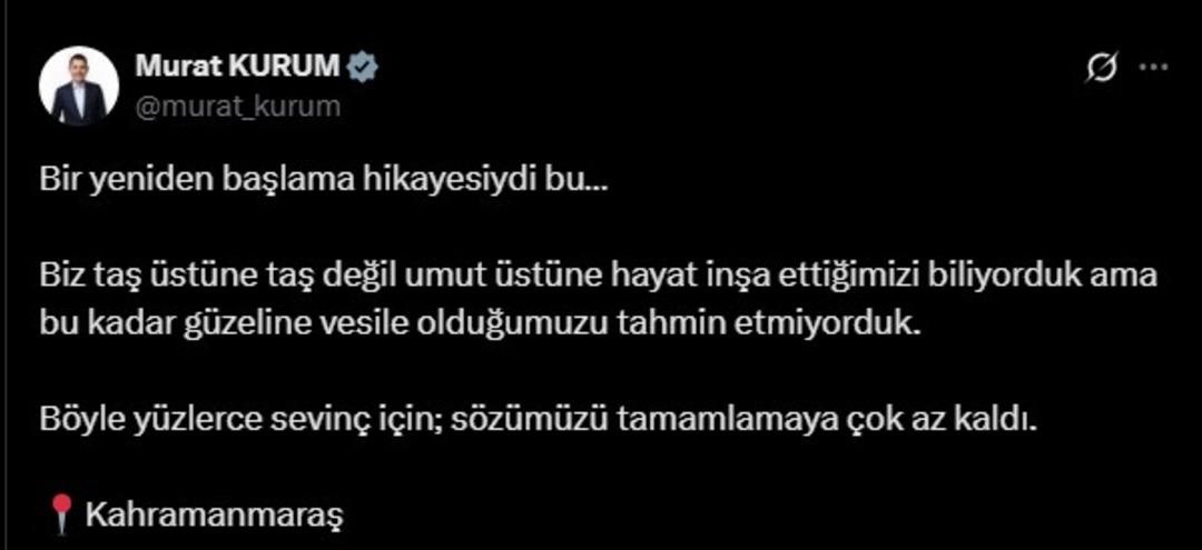 Çevre, Şehircilik ve İklim Değişikliği Bakanı Murat Kurum Koyunlu çiftinin yeni görüntülerini paylaştı ve "Bir yeniden başlama hikayesiydi bu. Biz taş üstüne taş değil umut üstüne hayat inşa ettiğimizi biliyorduk ama bu kadar güzeline vesile olduğumuzu tahmin etmiyorduk. Böyle yüzlerce sevinç için; sözümüzü tamamlamaya çok az kaldı" dedi.