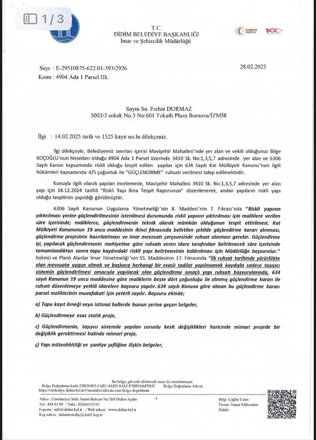 Ferhat Durmaz isimli vatandaş binasını güçlendirmek için Didim Belediyesine başvuru yaptı. Dedim Belediyesi dilekçeyi verdiği yanıtta sitedeki bazı blokların kaçak olduğunu itiraf etti. Çevre Şehircilik ve İklim Değişikliği Bakanlığı tarafından gönderilen yazıya rağmen yıkım kararını hala uygulamayan Didim Belediyesi, vatandaşın güçlendirme talebini de reddetti.
