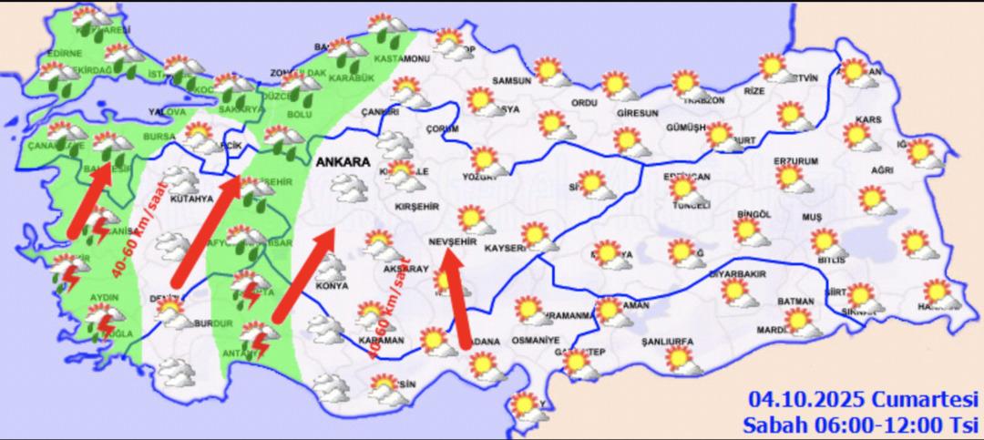 Ege, Akdeniz’in iç kesimleri ve İç Anadolu’nun güney ve batısında rüzgarın güneyli yönlerden kuvvetli (40-60 km/saat) esmesi bekleniyor. Bu nedenle yaşanabilecek olumsuzluklara karşı dikkatli ve tedbirli olunması gerekiyor.